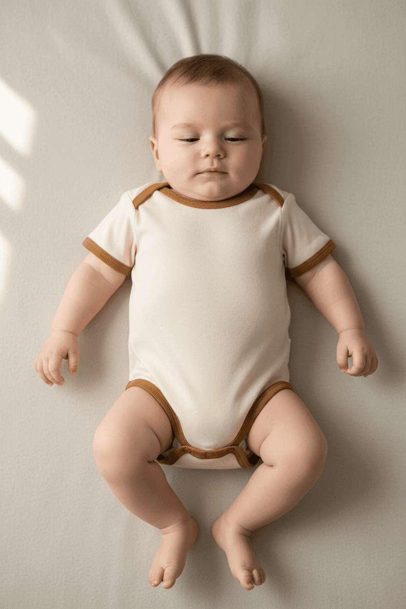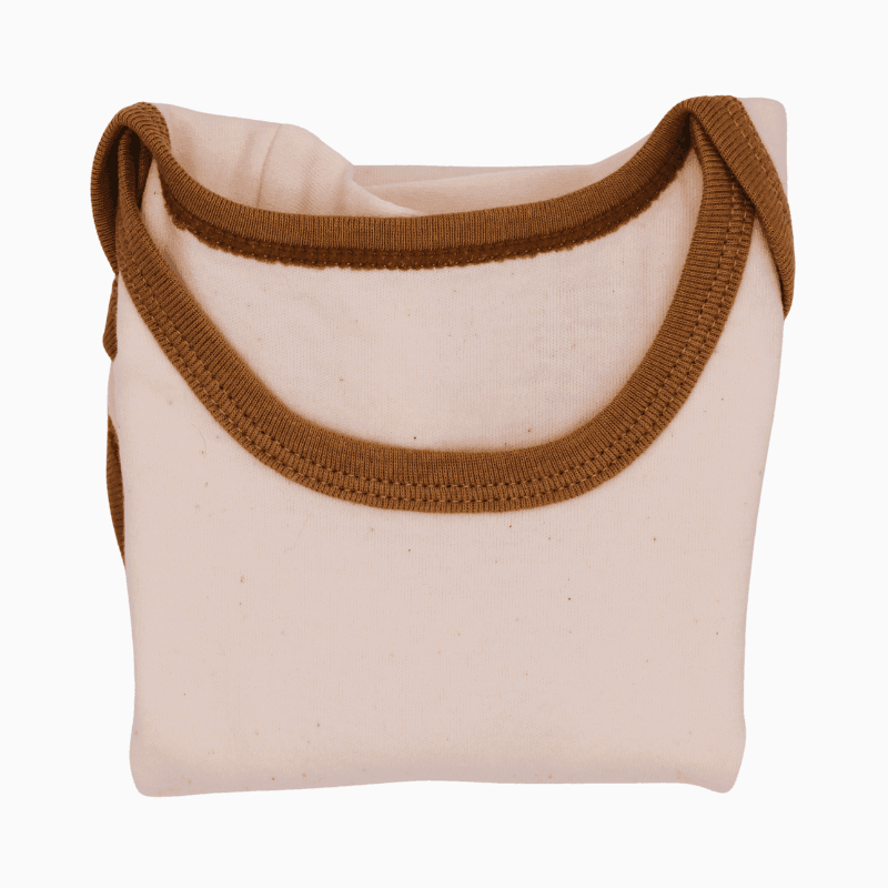 En color crema con ribetes en marrón chocolate, combina elegancia y naturalidad. Su diseño sencillo y funcional incluye un cierre de tres botones de clic en la parte inferior, facilitando el cambio de pañal.