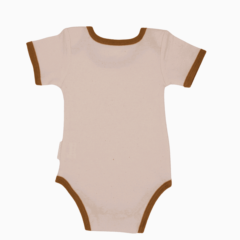 Body bebé de algodón orgánico manga corta, suave y transpirable, ideal para piel delicada. Color crema con ribetes marrones y diseño cómodo para el día a día.