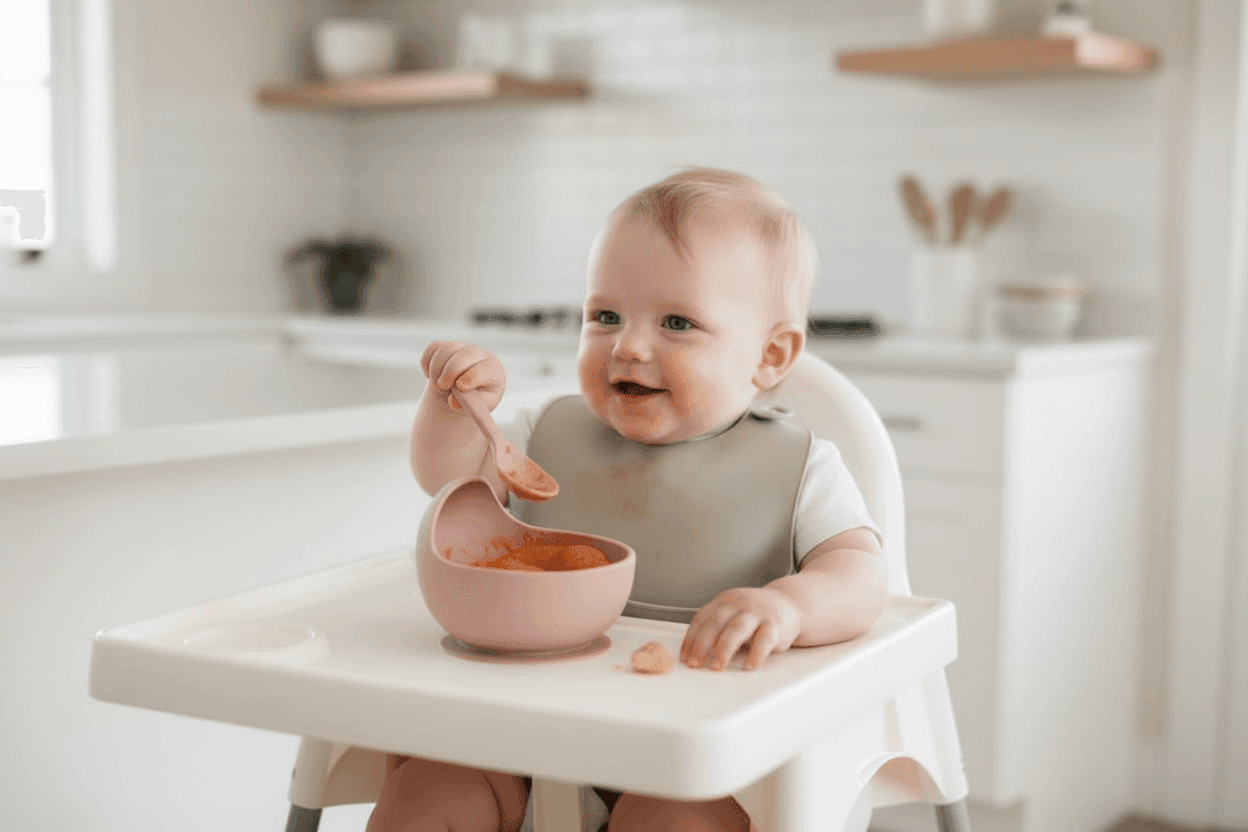 Cuenco de silicona con ventosa y cuchara en color rosa suave. Diseñado para facilitar la alimentación autónoma de los bebés, evitando derrames y garantizando seguridad y comodidad