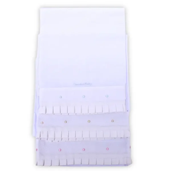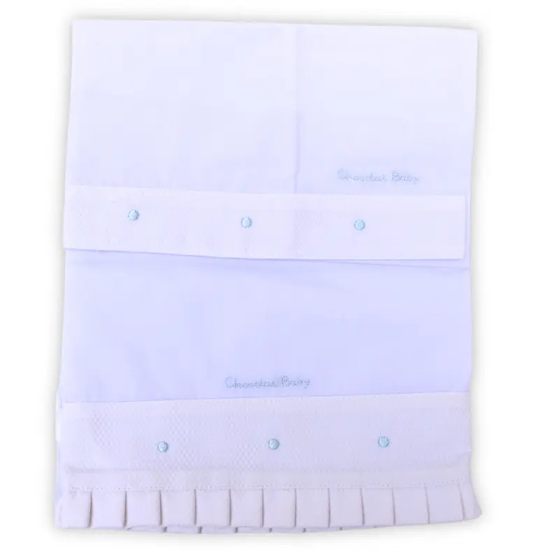 Confeccionado en tejido suave y agradable al tacto, este conjunto destaca por sus delicados detalles decorativos en el embozo, que aportan un acabado elegante y cuidado. Incorpora una banda decorativa en tejido tipo piqué con pequeños detalles bordados, así como un fino remate plisado que realza su estilo clásico.