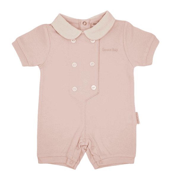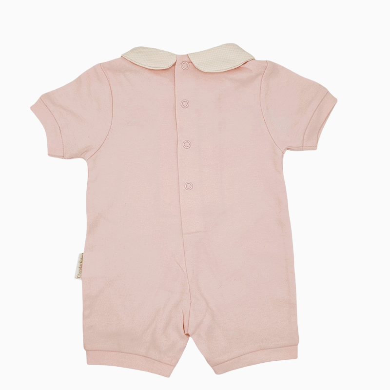 Pijama de una pieza para bebé de 6 meses de Chocolat Baby. Confeccionado en 100% algodón suave en color rosa con cuello y puños en tono beige. Presenta 6 botones en la parte delantera y un diseño clásico y elegante.