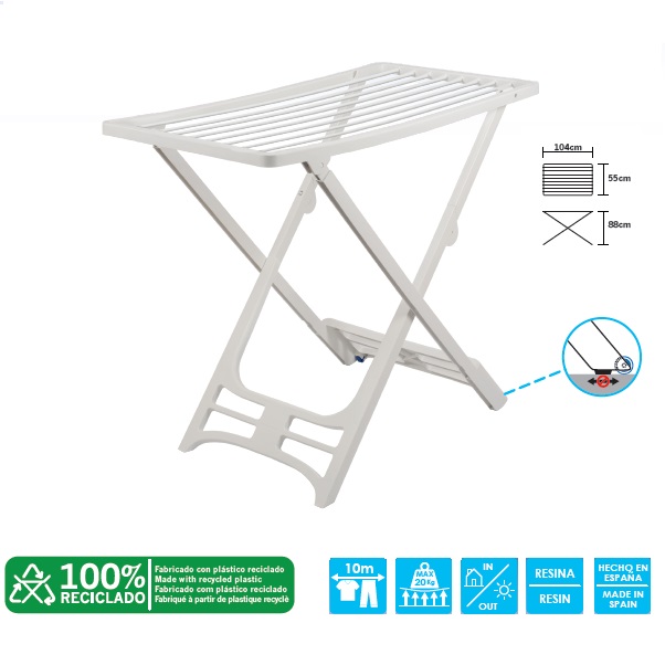 El tendedero plegable de resina sin Alas de Cuncial es una solución de secado versátil y respetuosa con el medio ambiente. Fabricado en España con plástico 100% reciclado de alta calidad, este tendedero es una elección sostenible que se adapta a tu estilo de vida.