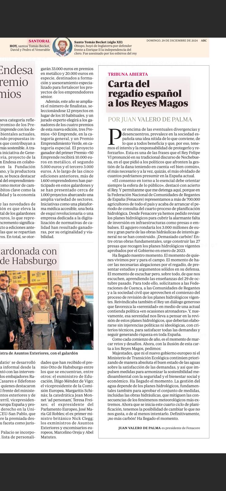 Tribuna abierta ABC del 29 de diciembre de 2024, por Juan Valero de Palma (presidente de la Federación Nacional de Comunidades de Regantes de España).