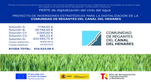 Para hacer realidad esta transformación digital, la Comunidad de Regantes del Canal del Henares contará con una financiación de 514.523,08 € por parte del Ministerio para la Transición Ecológica y el Reto Demográfico (PRTR – NextGenerationEU), que se reparten entra las diferentes soluciones indicadas anteriormente.