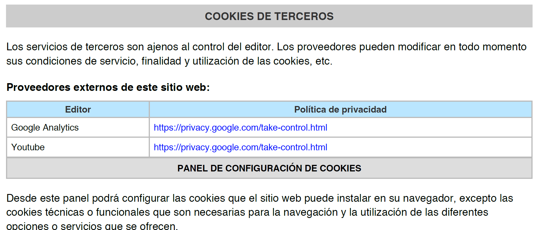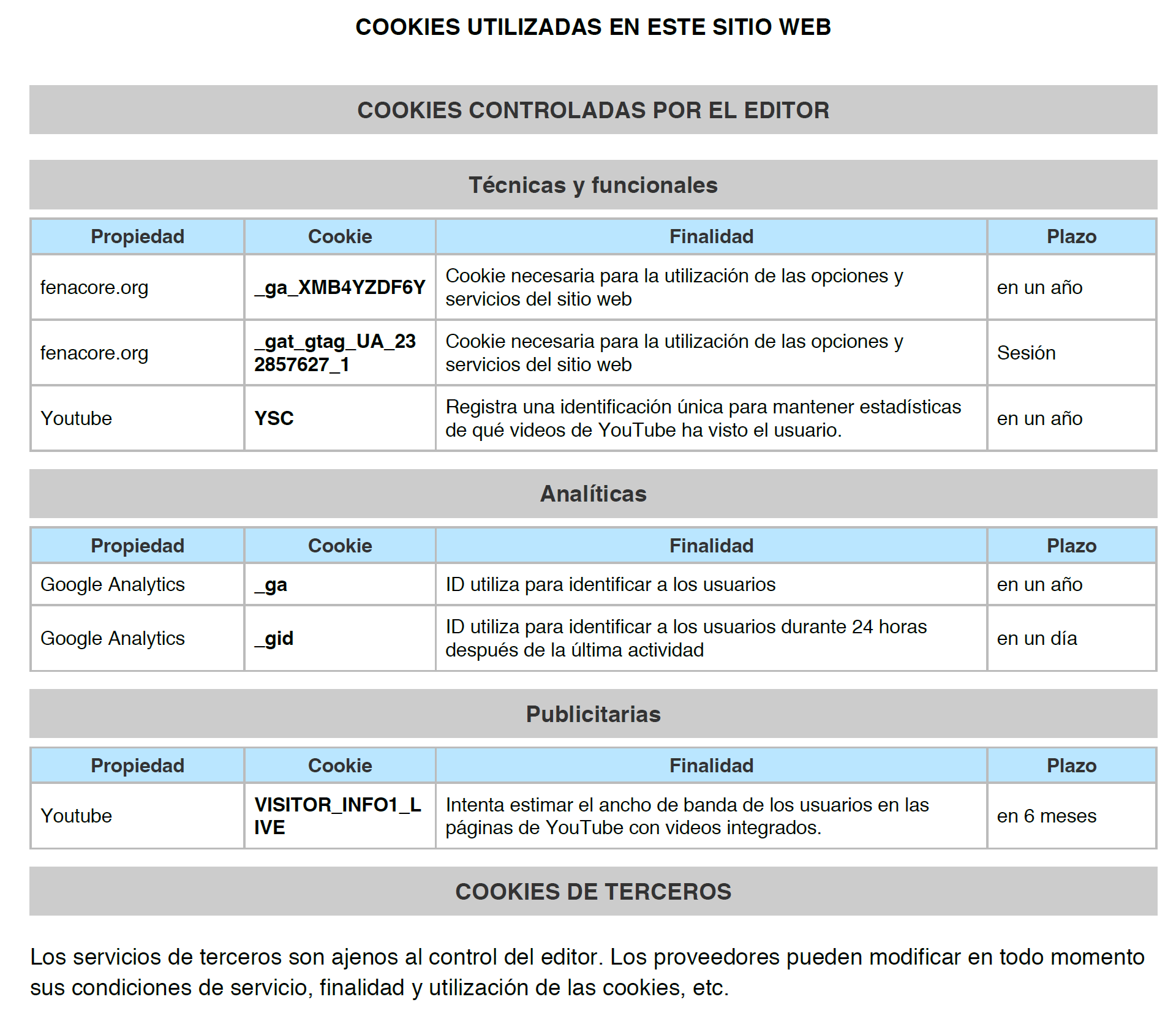 Conforme con la Ley 34/2002, de 11 de julio, de servicios de la sociedad de la información y de comercio electrónico (LSSI), en relación con el Reglamento (UE) 2016/679 del Parlamento Europeo y del Consejo, de 27 de abril de 2016, General de Protección de Datos (GDPR) y la Ley Orgánica 3/2018, de 5 de diciembre, de Protección de Datos y Garantía de los Derechos Digitales (LOPDGDD), es obligado obtener el consentimiento expreso del usuario de todas las páginas web que usan cookies prescindibles, antes de que este navegue por ellas.