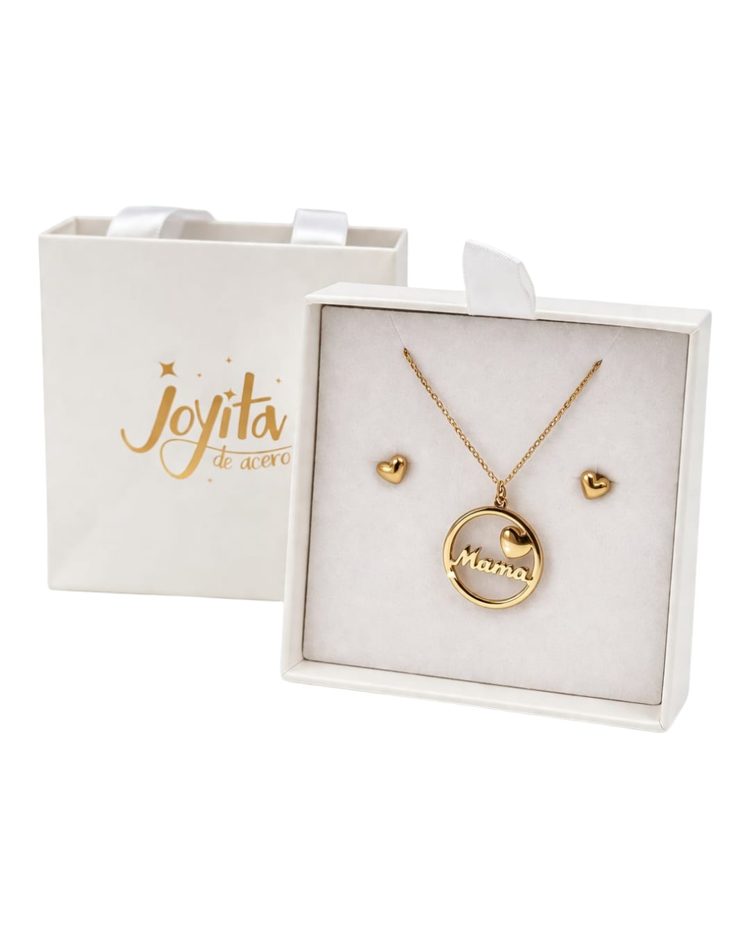 Incluye collar con colgante “Mamá” y pendientes a juego en forma de corazón, un detalle lleno de amor que podrá llevar siempre.