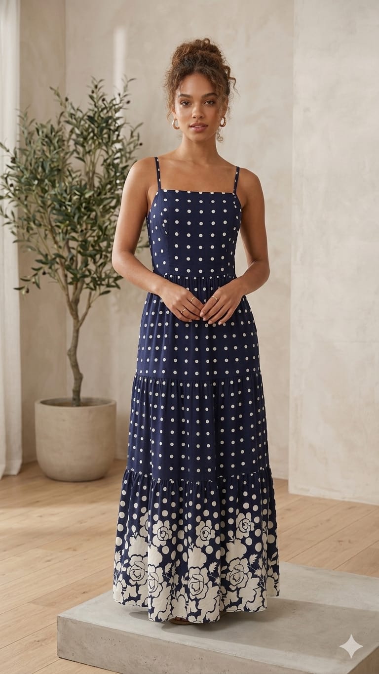 Este vestido es TODO lo que necesitas para verte femenina, fresca y estilizada. Disponible en 2 colores: Beige con lunares y flores marrón, y Azul marino con lunares y flores en contraste. 🌸