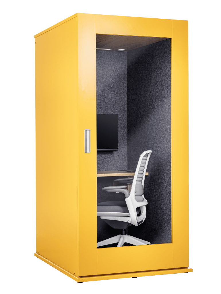 La cabina telefónica insonorizada Mute 100 es el lugar perfecto en la oficina para mantener conversaciones tranquilas y trabajar concentrado.