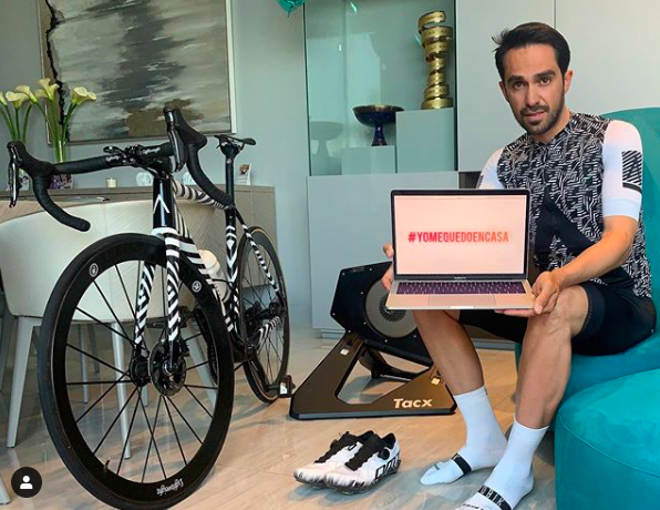 El ciclista español, Alberto Contador, ganador de las tres grandes, también está aportando su granito de arena en forma de sesiones de rodillo martes, jueves y domingo a las 19:00h en directo a traves del stories de su Instagram. Entrenar dirigido por una de las grandes leyendas de la historia del ciclismo siempre es un aliciente.