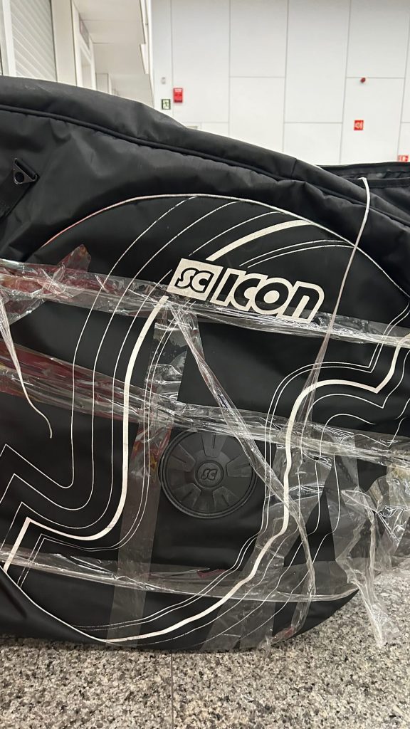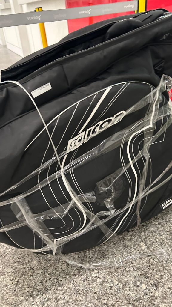 “OLE @iberia ayer mi maleta de bici no llegó en mi vuelo. Hoy al recoger la maleta me la encuentro así… reventada la cremallera y me ha desaparecido una mochila de su interior con material valorado en 3000 euros. Falta ver si a la bici le ha ocurrido algo, que no me extrañaría la verdad ¿Quién se hace cargo de esto?”