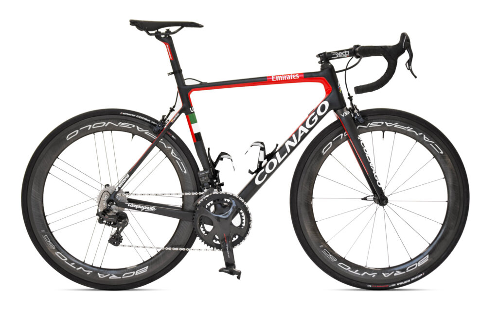 La primera de ellas, la Colnago V3Rs del esloveno Tadej Pogacar, vigente campeón del Tour con el UAE Team Emirates, que ha conseguido colocar a la histórica marca italiana en lo más alto del podio este 2020. La Colnago luce un cuadro de carbono monocasco con una línea sobria pero elegante y va vestida como no podía ser de otra manera con un conjunto de la prestigiosa marca Campagnolo. Para la transmisión se ha utilizado el modelo tope de gama de la marca, el Campagnolo Super Record EPS, mientras que las ruedas son unas Campagnolo Bora Ultra de carbono con un perfil de 60 mm. No se puede adquirir online, sólo en tiendas y distribuidores oficiales y con un precio de más de 9.000 euros al alcance de pocos ciclistas aficionados. En la web oficial podéis encontrar más información.