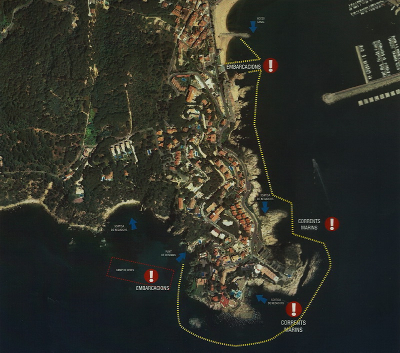 El inicio, se encuentra el extremo sur de la playa principal, en la playa de Can Rius, donde se halla un panel informativo con consejos de utilización y recomendaciones de seguridad, que todo nadador debería leer, antes de empezar. Se trata de un recorrido de aproximadamente unos 2.000 de longitud, balizado con boyas amarillas, el espacio para nadar es entre estas y la costa.