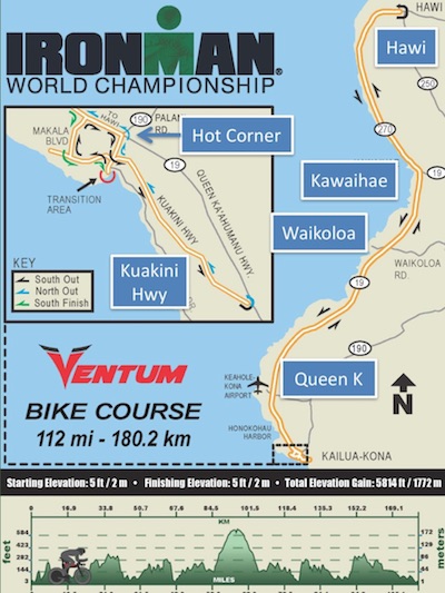 La primera parte del ciclismo es un pequeño circuito que lleva a los atletas fuera de la población hacia Queen K. Tras girar hacia la derecha para ir hacia Palani Hill y girar en el “Hot Corner“, una rotonda situada a unos 300 metros de la meta del Ironman de Kona. Los atletas bajan por Palani Hill, punto en el que no está permitido adelantar.