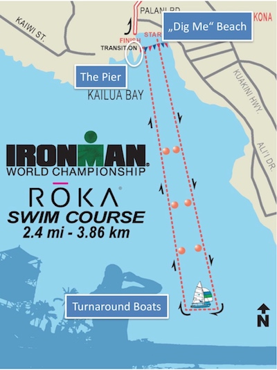 El punto de entrada a la natación del Ironman de Kona es “Dig Me Beach” una pequeñísima cala situada junto al muelle que todos hemos visto en alguna de las espectaculares imágenes de la salida del Campeonato del Mundo Ironman. El nombre de esta cala se debe al grito que los triatletas lanzan a los voluntarios y aficionados , “Dig me”, que traducido al español sería algo así como “ayúdame a salir” o “sácame“.