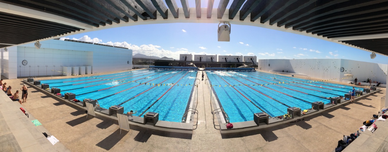 6 a.m suena el despertador, me levanto tranquila, en cambio Alberto está más nervioso. No se si es que aún no visualizo el día que me queda por delante pero voy a “ralentí”. Almuerzo energético, cojo el menú de carrera 2 barritas / sales y 2 geles. Bidones con agua y andando. Llegamos a La Santa una hora antes del inicio de la prueba, la pista de atletismo dónde se encuentran los boxes, está iluminada como si fuera un estadio de fútbol antes de un partido!! Parecemos “hormiguitas” por todos lados ultimando detalles, con nervios pero con una sonrisa en la cara y con ganas de empezar! Yo sigo mirando desde la barrera! Que me pasa… Toca neopreno por los pelos, los pros no han tenido la misma suerte. Me pongo el neopreno y directa a la laguna, a medida que voy llegando a la zona intento averiguar como van las boyas, ya se va palpando esa sensación de inicio, el día estaba nublado y sin viento, la zona del sector de la natación al ser en una laguna no tiene ni oleaje ni corriente.