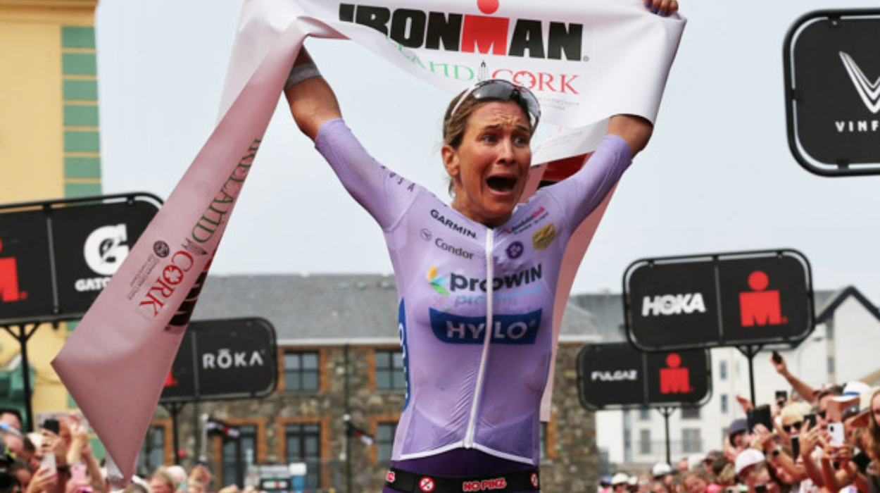 Svenja Thoes levantando la cinta del IRONMAN Cork antes de enterarse de que había sido descalificada. Foto: Huw Fairclough
