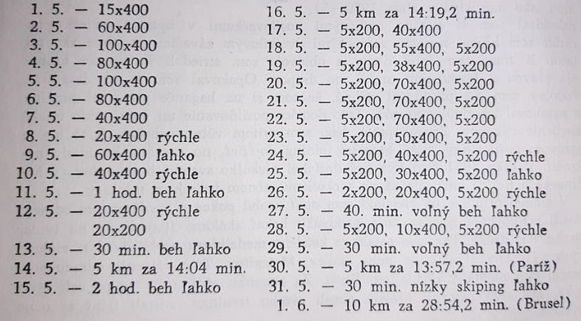 Tan solo para tener una referencia de los ritmos, parece ser que solo apuntaba lakho para indicar fácil y rychle para designar el ritmo fuerte, dos cambios de ritmo que se adaptan a su filosofía de “Si quieres correr rápido en una carrera, debes entrenar rápido”