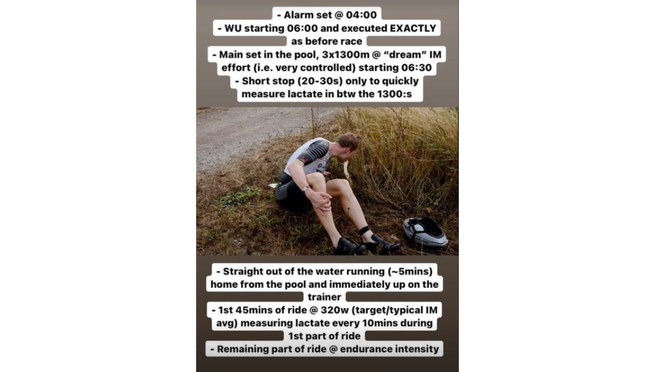 Intentando simular al máximo un día de competición, Svenningsson se ha levantado a la misma hora en la que lo haría en un IM (4a.m.), ha calentado a la hora que lo haría en competición y exactamente lo mismo que hará en su próxima prueba, y después ha realizado 3x1300m nadando (ritmo IM), con 20s-30s de descanso para medir el lactato. Una vez ha terminado la última serie, ha ido corriendo a casa (unos 5 minutos) como si fuese una transición y se ha subido en el rodillo para hacer un entrenamiento en bici, con una serie nada más empezar de 45 minutos a 320w (lo que suele mover en IM), midiendo el lactato cada 10 minutos.