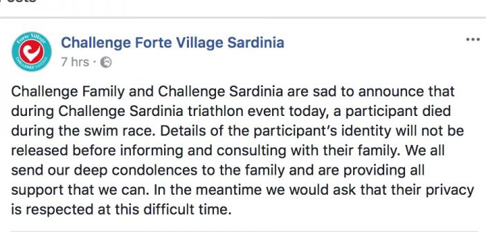 Challenge Family y Challenge Sardinia se entristecen por anunciar que durante la celebración en el día de hoy del triatlón Challenge Sardinia, ha fallecido un participante durante el segmento de natación. Los datos sobre la identidad del atleta no se harán públicos por expreso deseo de su familia. Queremos enviar el pésame a la familia y todo el apoyo que podamos. Mientras tanto pedimos que se respete la intimidad en estos díficiles momentos