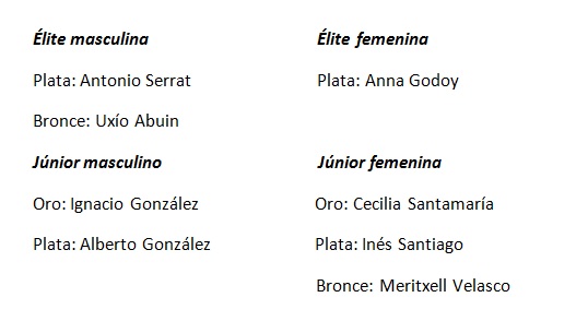 En categoría élite, lo llegó ningún oro pero si dos platas y un bronce. Entre los hombres, el joven Antonio Serrat estuvo cerca de proclamarse campeón de la Copa de Europa pero el británico Gordon Benson le dio caza en el tramo final de la carrera a pie e impidió al gallego ganar en casa. El también gallego Uxío Abuin, que ha empezado el año con buenos resultados, remontó en el tercer sector y se llevó el bronce. Dos plazas de podio muy luchadas. David Castro acabó séptimo.