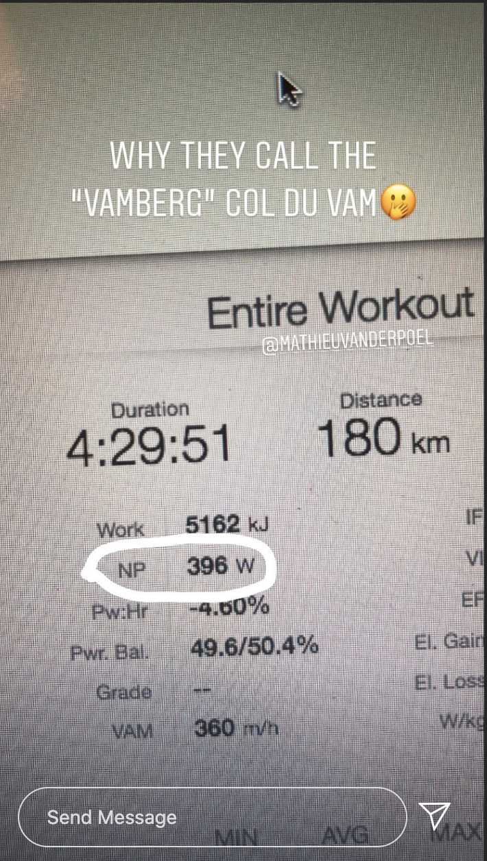 De hecho, se estima que su FTP estaría sobradamente por encima de los 400w, cosa que iría de la mano de la última exhibición de Mathieu van der Poel, un deportista nacido por y para la bici.