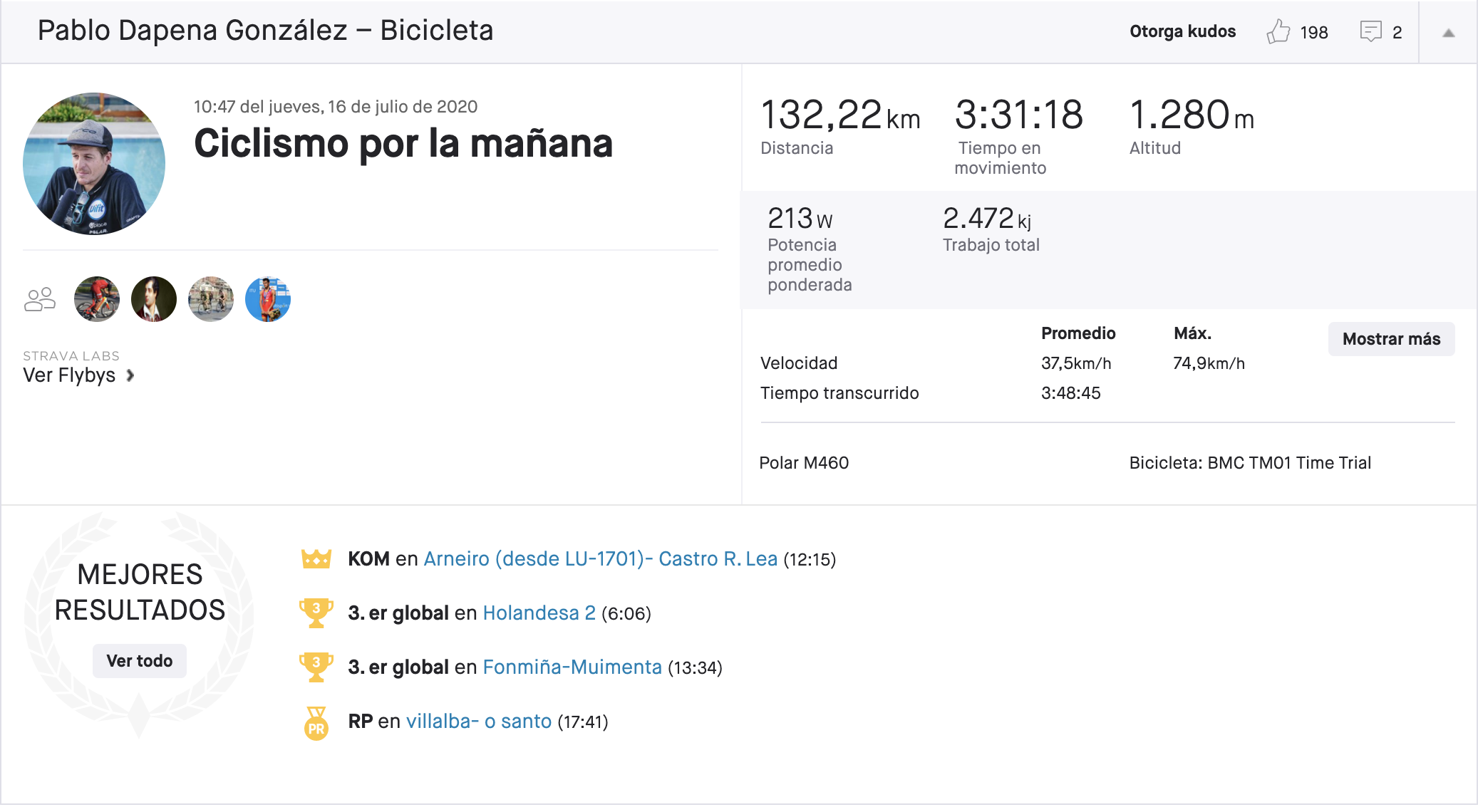En total, 132 kilómetros a ritmo, con una media de +37 km/h, y sin ninguna parada para tomar café, un día de coger rueda y aguantar. Un calentamiento de hora y media, seguido de 4 bloques de 5′ en zona media para entrar en calor y prepararse para la acometida final, 1h full gas.