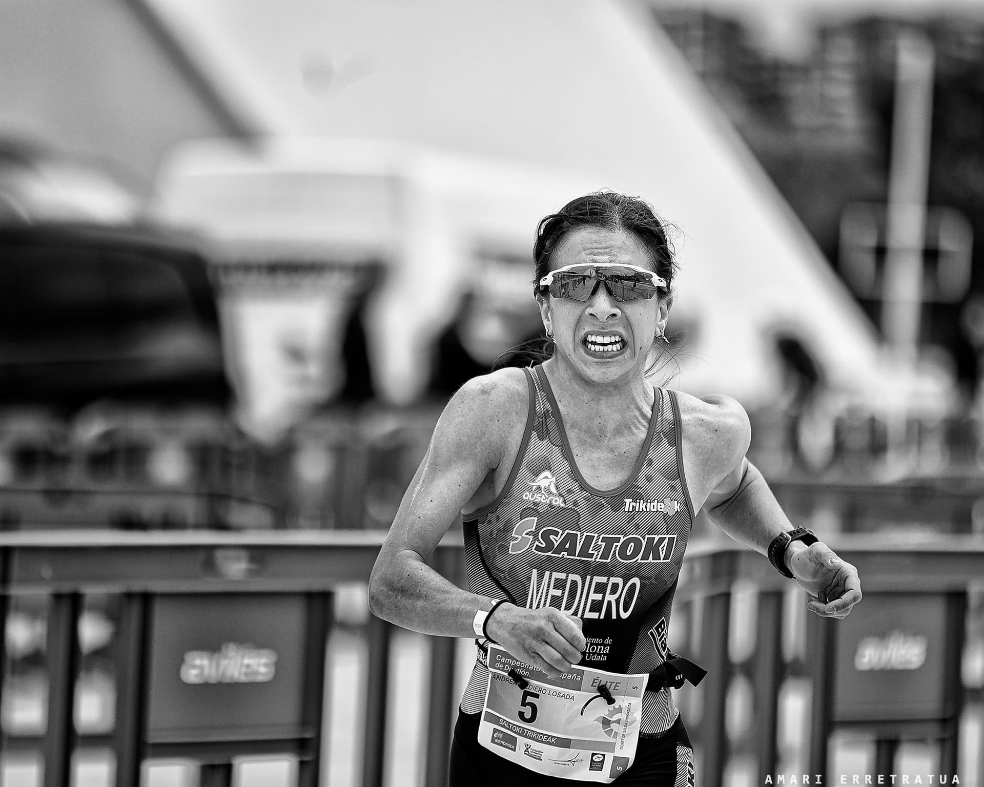 Representando al conjunto navarro Saltoki Trikideak, Andrea Mediero luce impecable en esta imagen en la prueba de Avilés, pues es habitual encontrarla siempre en el Campeonato de España de Duatlón junto a muchas otras grandes atletas féminas. En la prueba élite del equipo femenino Mediero logró una 18ª posición.
