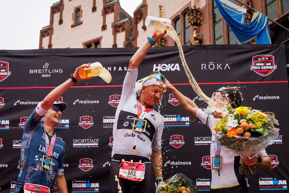 FRANKFURT (ODER), GERMANY - Gregory Barnaby of Italy, Kristian Blummenfelt of Norway and Kieran Lindars of Great Britain celebrating their victory by showering each other with beer during the flower ceremony of the 2024 IRONMAN European Championship Frankfurt on August 18, 2024 in Frankfurt (Oder), Germany. (Photo by Jan Hetfleisch/Getty Images for IRONMAN)