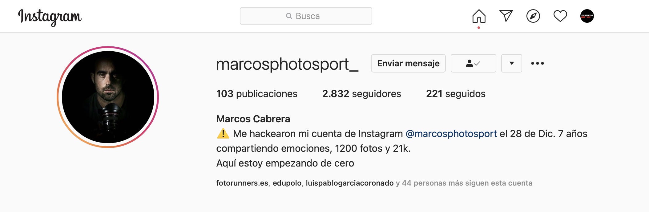 El fotógrafo Marcos Cabrera ha visto como su perfil social en instagram ha sido sustraído por un hacker. Un caso que desgraciadamente no es atípico en nuestro mundillo.