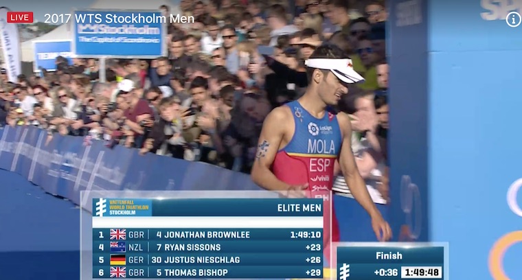 A falta de 800 metros Mola se ve sorprendido por un ataque del local Kristian Blummenfelt al que le siguen el francés y el británico Bishop y paga el esfuerzo quedando descolgado de los puestos de podio a pesar de haber liderado gran parte del 10k final.