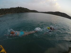 Si conseguimos mantener ese buen ritmo de competición a pies, ¡perfecto! Colocarnos al lado del compañero es otra buena opción,  yendo a la cadera del mismo, habiendo también beneficio en el nado, teniendo mayor margen de maniobra ante cualquier cambio de ritmo en competición.