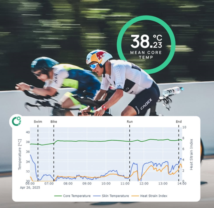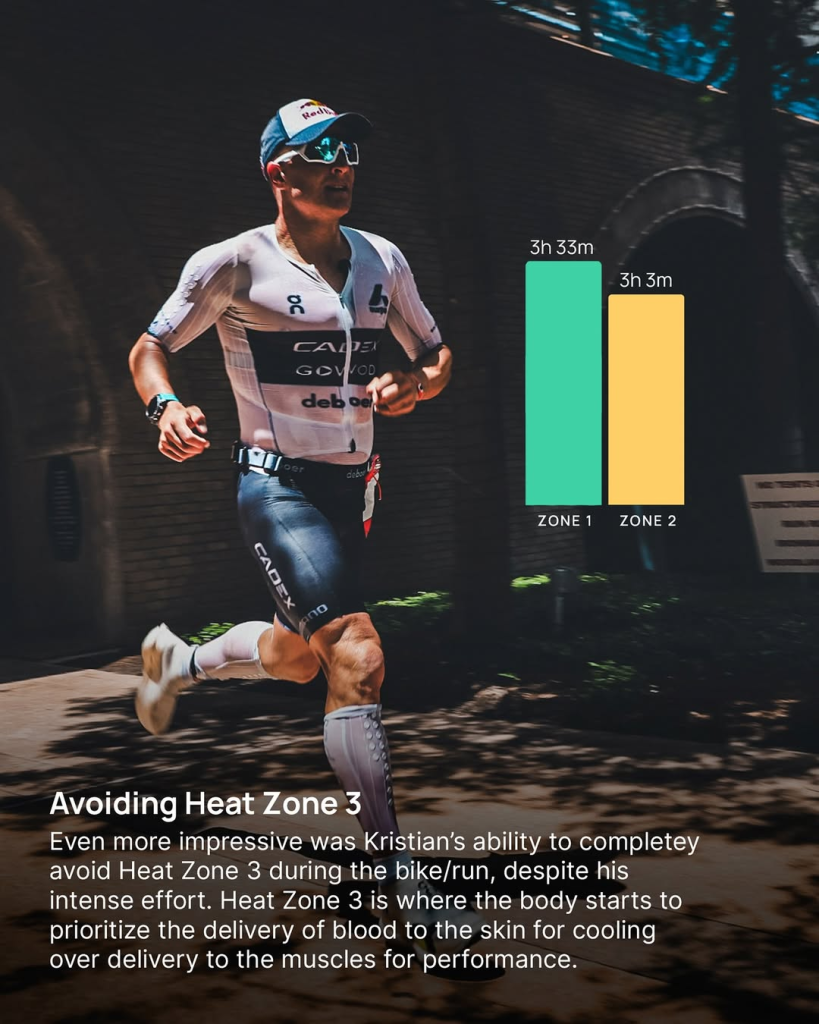 Por el otro, dichos bloques de entrenamiento junto a la exposición al calor durante las dos semanas previas a la carrera permitieron a Kristian mantener su temperatura central y de la piel impresionantemente bajas teniendo en cuenta la humedad y las altas temperaturas del aire (30°C/86°F).