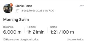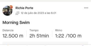Cuando ves en un Strava un día de entrenamiento en el agua como este 12.000m / 2h42min / 1’21/100m puedes pensar que se trata de un gran nadador o un gran triatleta/aquatleta. Pero en este caso se trata de un día de entrenamiento del ex ciclista profesional Richie Porte y desde la revista nos preguntamos ¿Qué estará tramando Richie Porte?
