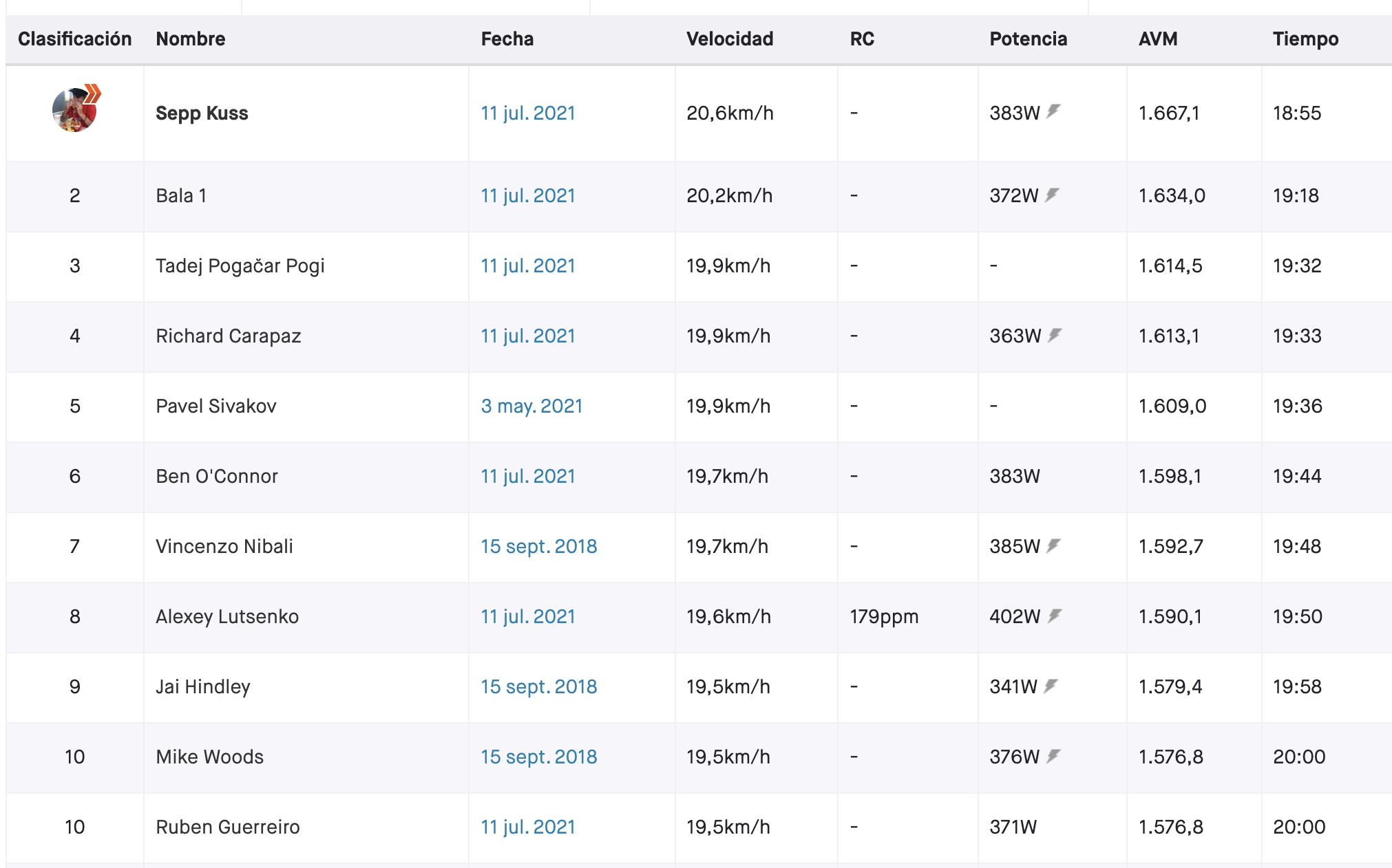 Kuss alcanzaría la cima con un crono de 18:55, lo que supone un zarpazo increíble de más de de 40” que el 19:36, marcado por Pavel Sivakov (Ineos Grenadiers) durante un stage en mayo.
