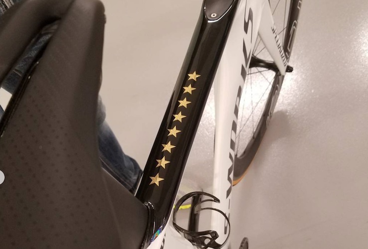 Cinco estrellas correspondientes a sus campeonatos del mundo de Series Mundiales ITU, 2 mundiales IRONMAN 70.3 y una ocatva para el título del Mundial Xterra conseguido en 2012 forman la línea medular del diseño de la nueva Specialized Shiv que Gómez Noya utilizará para intentar sumar el Campeonato del Mundo Ironman y sumar, por qué no, una novena estrella.