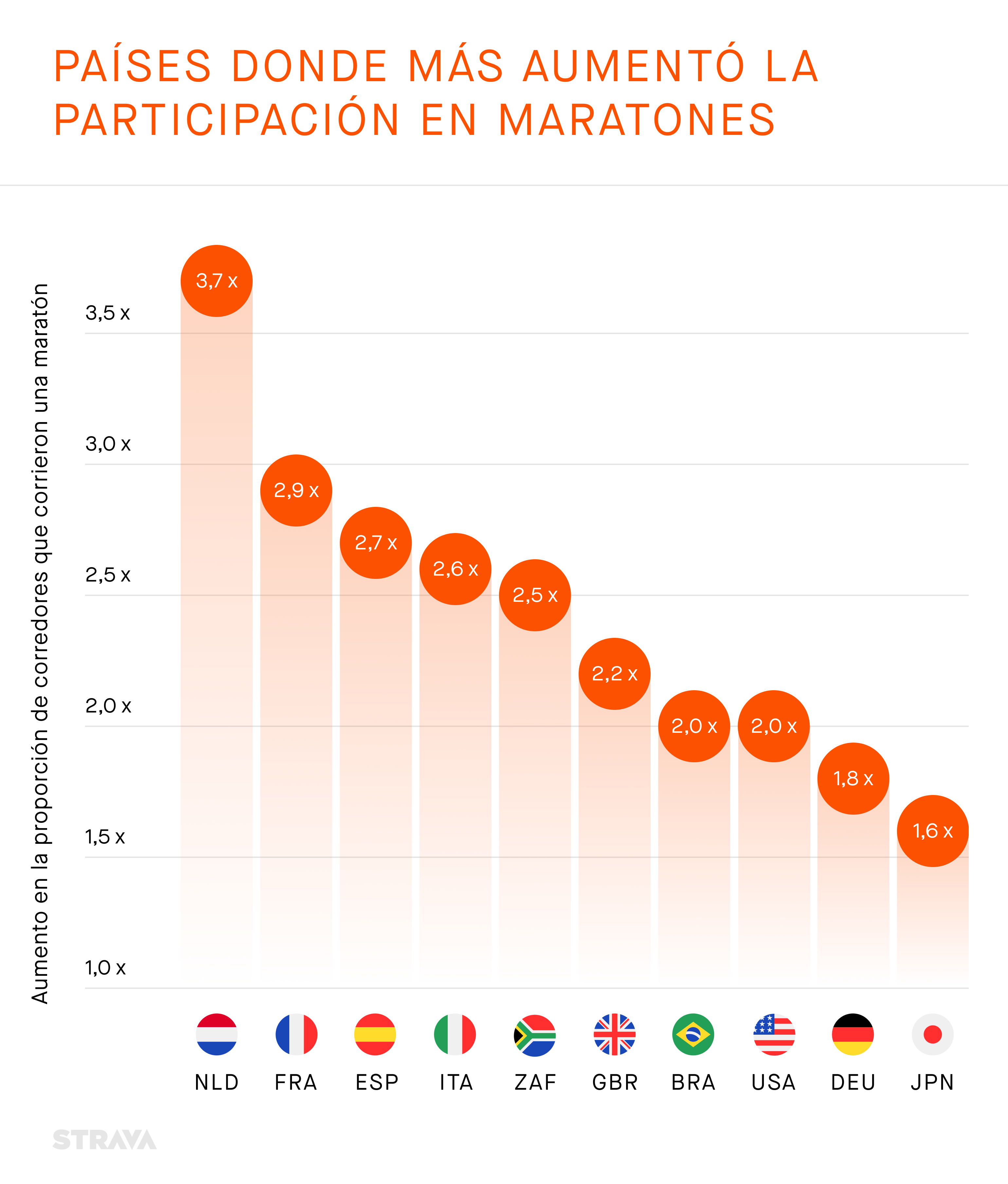 El porcentaje de corredores que han completado una maratón ha sido casi el doble que en 2021, lo que demuestra que, tras la pandemia, los corredores quieren estar codo con codo en la línea de salida tras años de distanciamiento social. Los deportes que han crecido más rápido son aquellos que se practicaron en espacios comunes (los que tuvieron que cerrar durante el primer año de la pandemia). Además, los viajes a otros países están experimentando un auge, con un 101 % más de actividades publicadas por deportistas desde el extranjero respecto al año pasado.