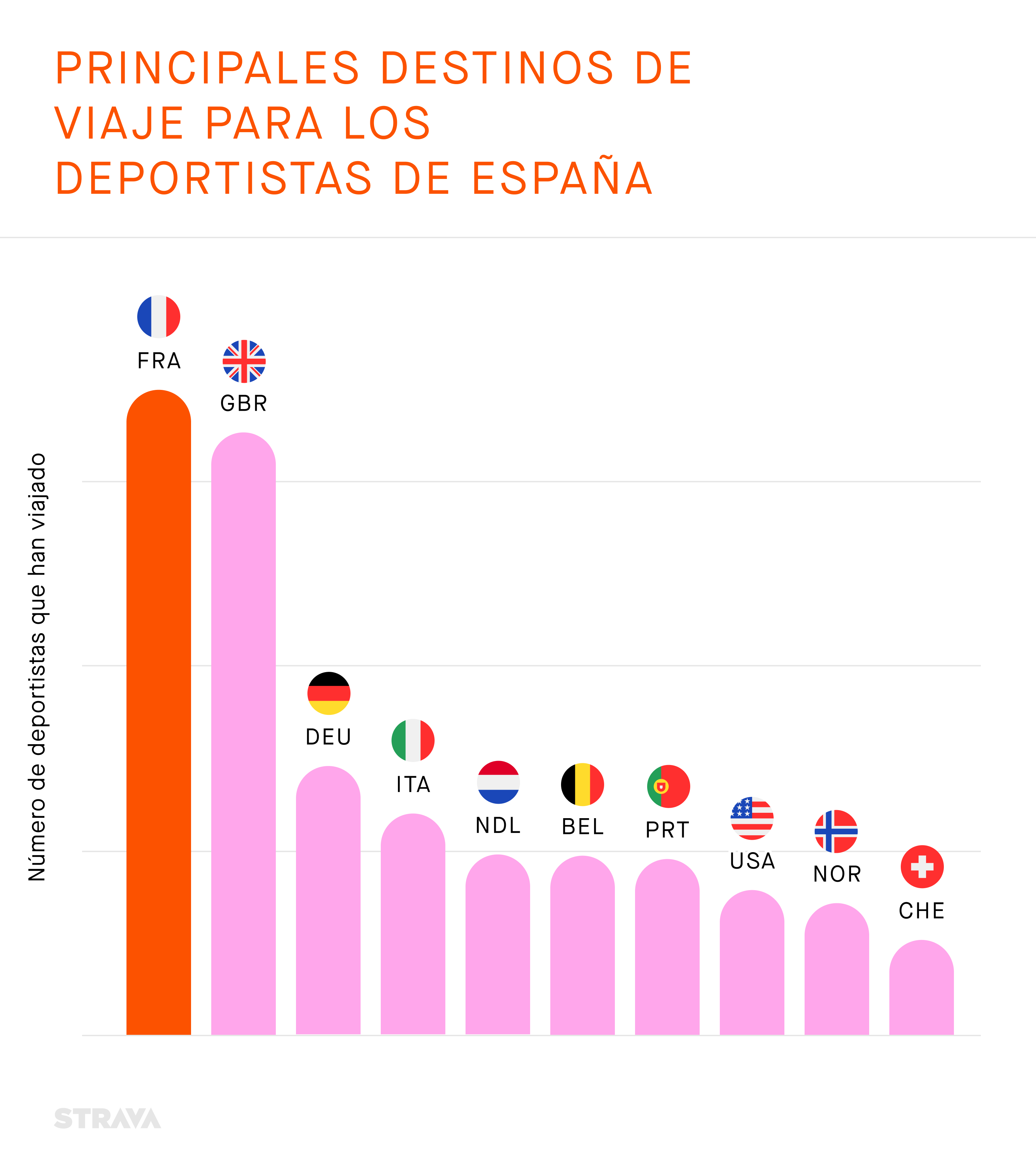 - Los destinos internacionales están casi al nivel prepandémico: este último año, el porcentaje de deportistas que registraron actividades fuera de su país fue del 101 %, frente a un modesto 3 % en 2019 (antes de la pandemia).