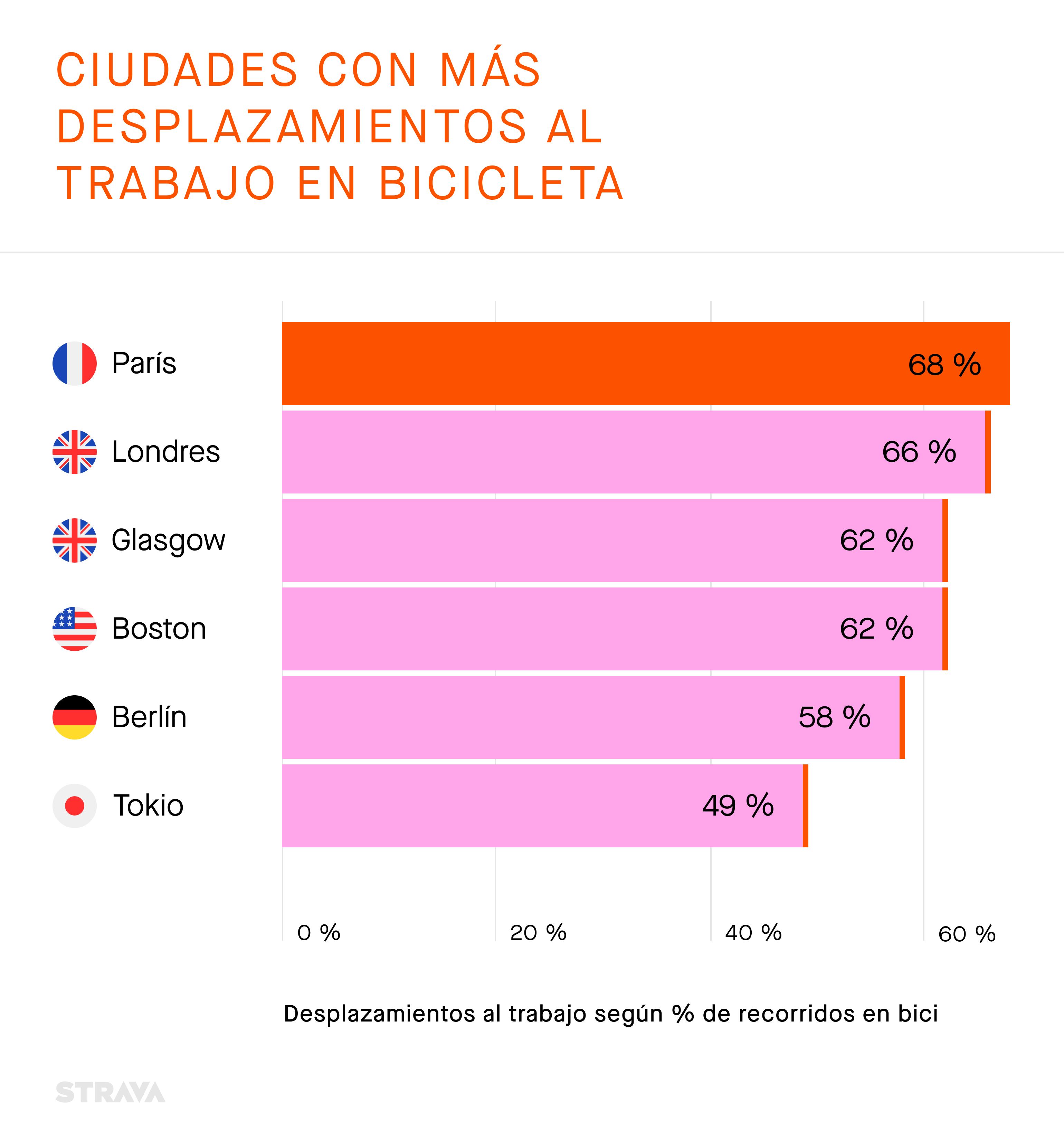 - Las bicicletas eléctricas han llegado para quedarse: el porcentaje de ciclistas en Strava que realizaron actividades con bicicleta eléctrica ha aumentado un 26 % este año. Las actividades con bicicleta eléctrica tienen un 30 % más de probabilidades de ser desplazamientos al trabajo en comparación con actividades en bicicleta. En 2022, los desplazamientos al trabajo en bicicleta casi han alcanzado los niveles de 2019. Existe también una clara tendencia a que estos desplazamientos se realicen los martes y los miércoles, en vez de los lunes.