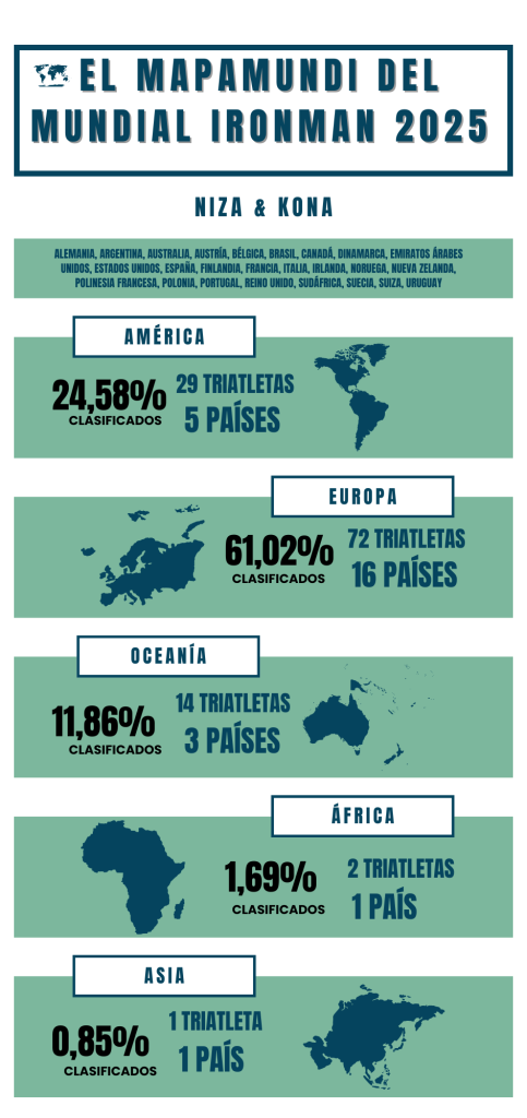 En 2025 los cinco continentes habitados contarán con algún representante en el Campeonato del Mundo, bien sea en Niza, en Kona o en ambas citas en las que reunirán deportistas de hasta 26 naciones.