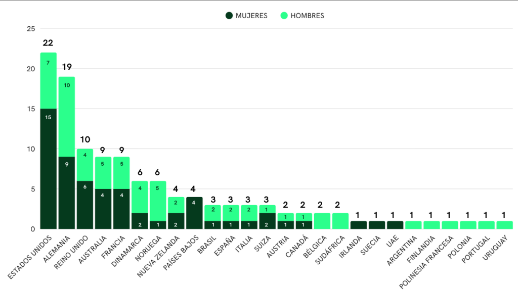 Mientras que Australia tira de raíces y tradición para mantenerse en la pomada con una delegación sin una gran estrella con opciones, pero sólida – rozando la decena – que les permite estar en ese TOP5. Aspecto en común con Nueva Zelanda que con cuatro participantes se mantiene en el TOP8 mundial pese al crecimiento de otros países como los nórdicos Noruega (6) y Dinamarca (6) que ya le superan. El dato curioso lo aporta Países Bajos que con únicamente representación femenina (4) se cuela en el TOP10.
