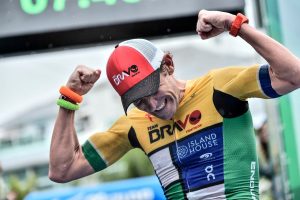 Noya cruzando primero la meta del Mundial IRONMAN 70.3.