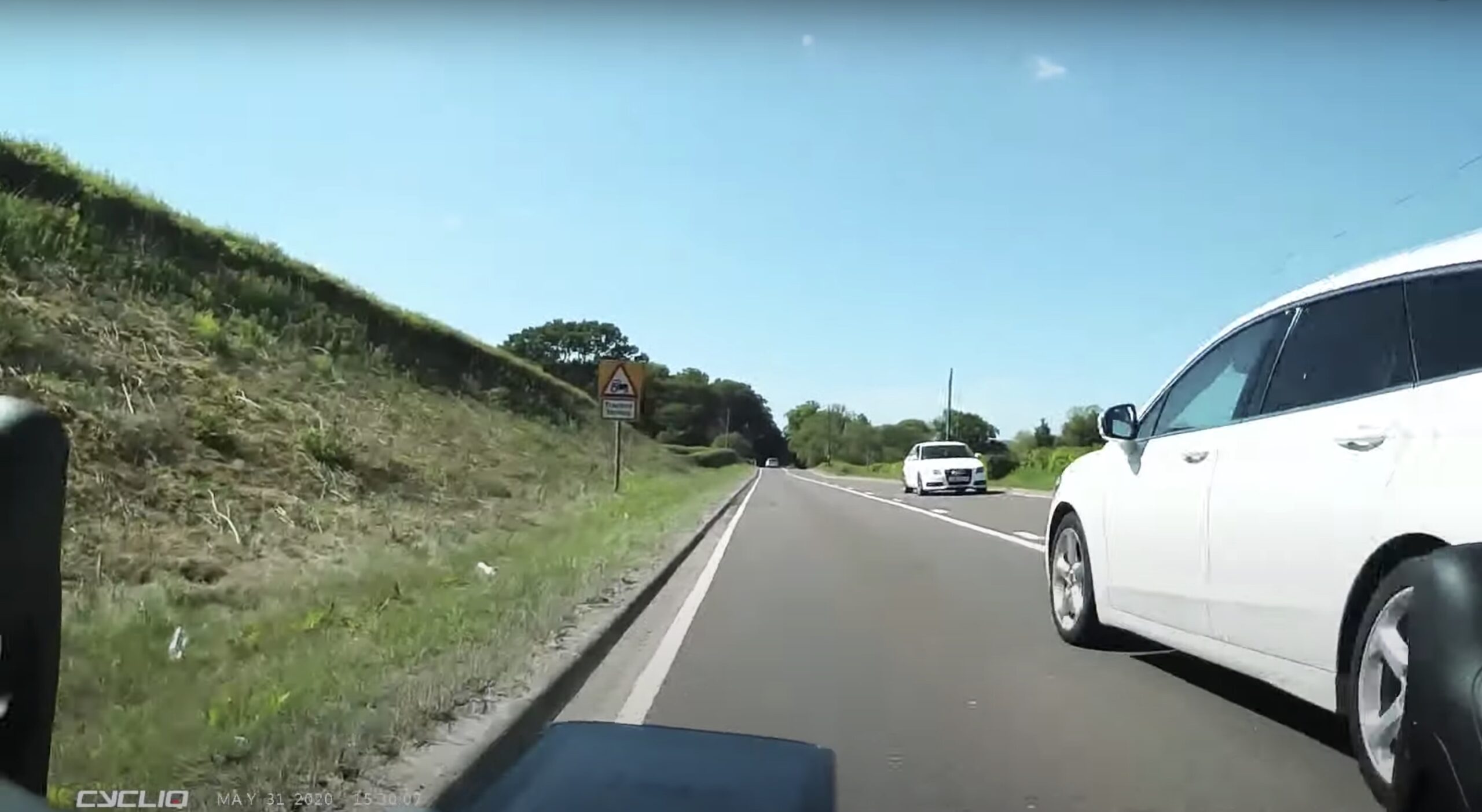Gracias a él, consigue grabar un adelantamiento peligroso que realiza un coche, justo cuando otro conductor pasa cerca de ellos en sentido contrario, generando una triple situación de peligro.