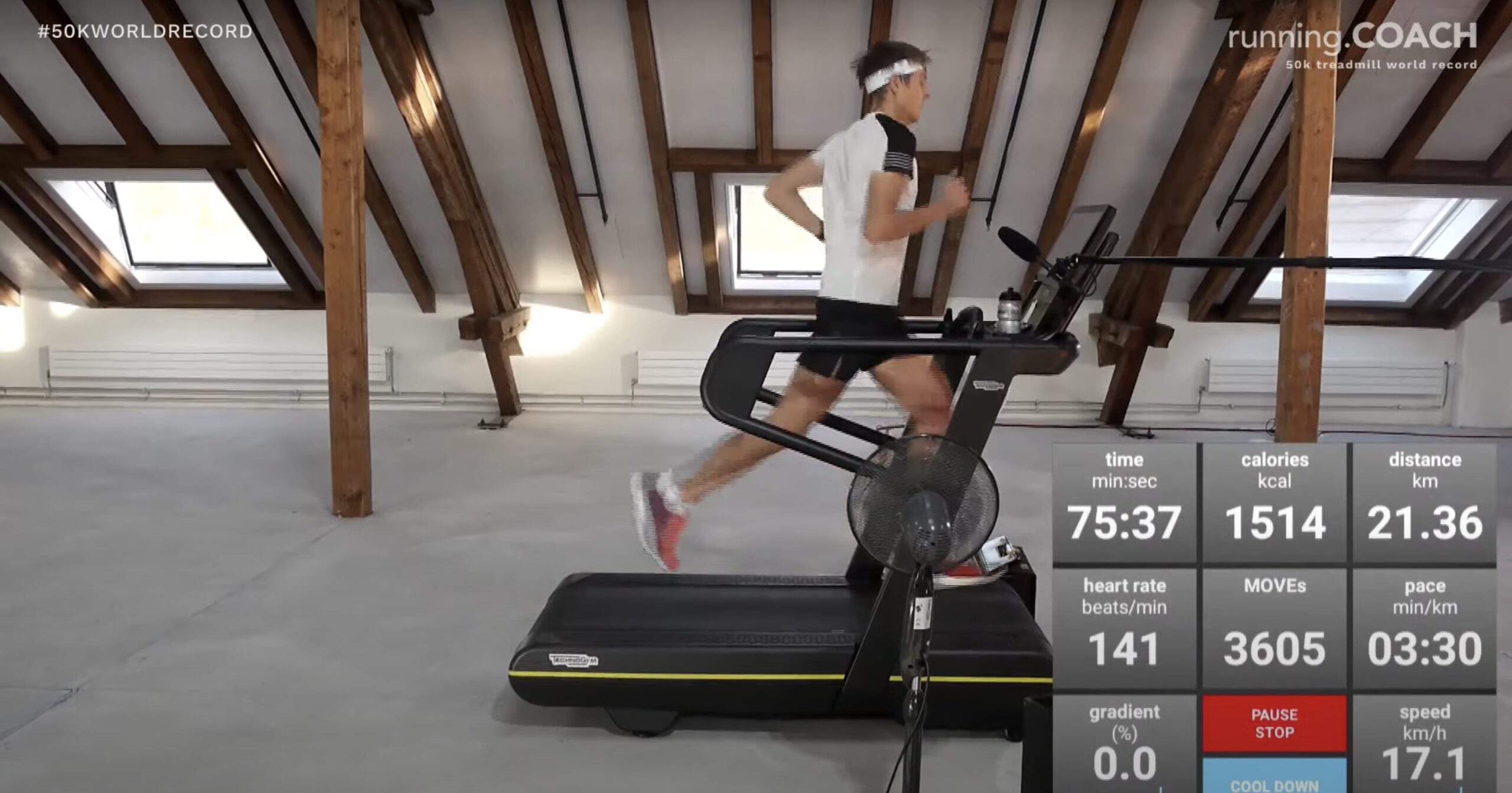 El método empleado fue el de dejar la cinta a ritmo de récord: 17,1 km/h e ir incrementando ligeramente el ritmo en los kilómetros finales para hacerse con la plusmarca