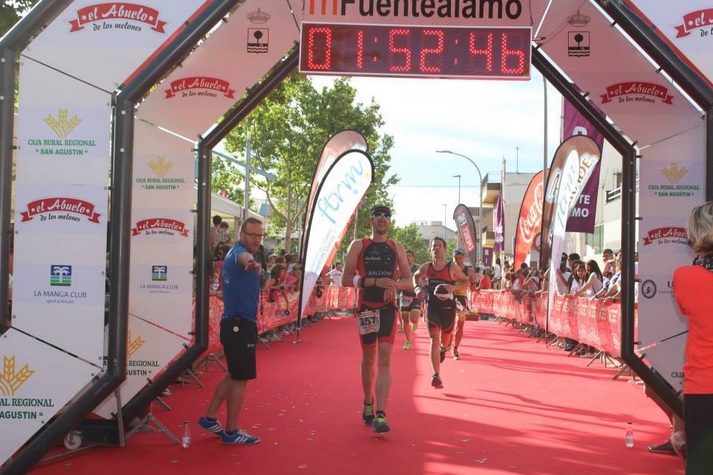 Como os digo es mi primera participación, la salida es desde una de las playas de Mazarrón, me resultó una natación rápida, algo accidentada porque salía en el grupo más numeroso y dispuesto a dar guerra y arañar posiciones y segundos, eso se traduce en golpes e incomodidad sobre todo al paso por la primera boya. Salí del agua en poco más de 12 minutos para los 750m, neopreno fuera y a la bici, como siempre os digo las transiciones las hago muy rápidas, las tengo interiorizadas y en un triatlón corto puedes ganar mucho. al subir a la bici me encontraba con fuerzas así que empecé a tirar, venían 11km de subida que me habían dicho que era pesadita, más aún por el calor. Por lo visto como iba avisado se me hizo corto esperando encontrar más dureza, eso es buena señal. A partir del km11 venían 4 de bajada bastante técnica y 9 de falso llano para llegar a Fuente Álamo, me junté con un buen grupo entre los que tenía un par de amigos, gracias a ellos y a la buena coordinación hicimos un gran parcial en bici, ya no recordaba lo que era competir con draft, ellos me empujaron a seguir el ritmo cuando iba seco, no tenía nada más que sacar de mi cuerpo y solo pensaba “a ver quien corre ahora!”. De nuevo transición rápida, esta vez en Fuente Álamo (las transiciones en este triatlón son disociadas, coges la bici en un pueblo y la dejas en otro, mérito de la organización pues no es nada fácil coordinar esto). Y si, al parecer quedaban algo de fuerzas para correr, me encontré con fuerzas, realizando una buena primera vuelta y una mejor segunda. Así que algo más que satisfecho en mi debut en Fuente Álamo, triatlón duro por la rápido que se va, las pulsaciones fueron disparadas desde el primer momento.