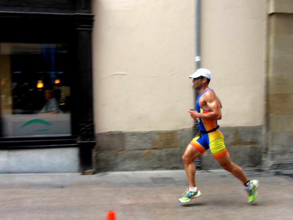 T2 más o menos rapidita y a correr con cierta confianza. Sabía que iba en buen puesto y que había guardado de más, incluso sospechando que me había pasado de conservador. No todos los días se tiene tan buen royo en la bici, la verdad. Nada más salir el ambiente me envuelve. Pero que esta pasando aquí??? Que hace tanta gente? Si señor, estaban animando. Vitoria entera se apostaba a lo largo de los 7.5km de carrera a pie con calles repletas en varias filas, indescriptible por más que me esfuerce. Y no solo cantidad, sino calidad. Totalmente involucrados, animando, llamándote por tu nombre, corras a 3.30 o a 5.30, para ellos eres el protagonista y te lo hacen saber bien alto. Como decía 7.5km de carrera pie, pero a 4 vueltas. Tenía en mente intentar hacer al menos 15km por debajo de 4 y los otros 15 ver si había forma de mantener el ritmo. De ilusiones tb se vive. En bici había comido bien, y en la carrera pensaba no pasarme pero…. Por el km 3 me tomo un gel y al poco noto que algo no va bien.