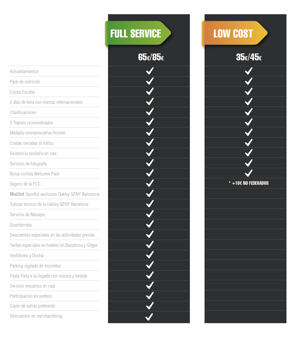 En su primera edición, la Oakley GFNY Barcelona ofrecerá un enorme abanico de servicios al ciclista que compita en la prueba. En función del tipo de inscripción escogida, los participantes dispondrán de un fantástico maillot Sportfull, servicio de descarga tras la carrera, duchas, avituallamientos, atención mecánica en carrera, parking vigilado, cronometraje oficial, seguro, welcome pack o carreteras cortadas, entre muchos otros servicios.