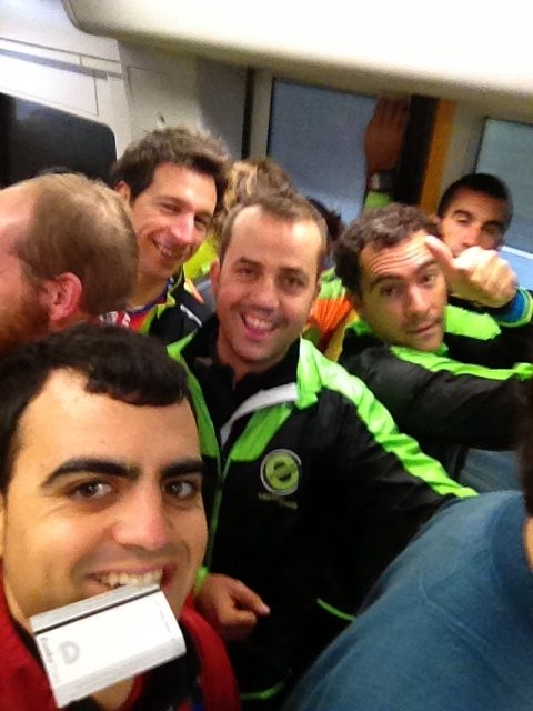 En la estación ya había mucha gente esperando al tren, entre ellos nuestros compañeros/compatriotas del Tri Zierbena con los que compartimos viaje. Pronto empezamos a sentir que aquella prueba era diferente, en el primer tren no entramos, así que esperamos con cierto nerviosismo al siguiente, el cual no venia parecido, pero con un poco de decisión y algún que otro empujón entramos…lo peor es que en cada estación, teníamos algún animado que seguía entrando por lo que llegamos a la parada final encajados casi sin poder movernos. Allí empezamos a pensar que locura es esta… el año que viene no vuelvo.