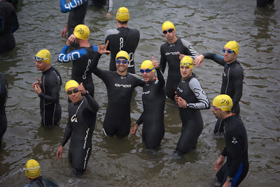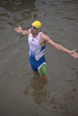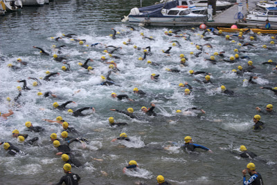 Dan la salida y todavía alguno en la rampa de acceso sin ni siquiera meterse en el agua, tampoco es que estuviera el agua helada…hasta algún valiente se atrevió a nadar solo con el tritraje. Si, como lo leeis, un tal Tomás, ya averiguaremos quién es para darle un trofeo a la osadía, hizo el agua ¡sin la ayuda del neopreno!