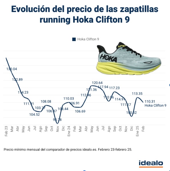 Un ejemplo claro de esta tendencia es el de las Hoka One Clifton. Este modelo fue lanzado en febrero de 2023 con un precio medio de 140,07€. Nueve meses después, su precio medio había bajado un 32%, situándose en 95,78€.
