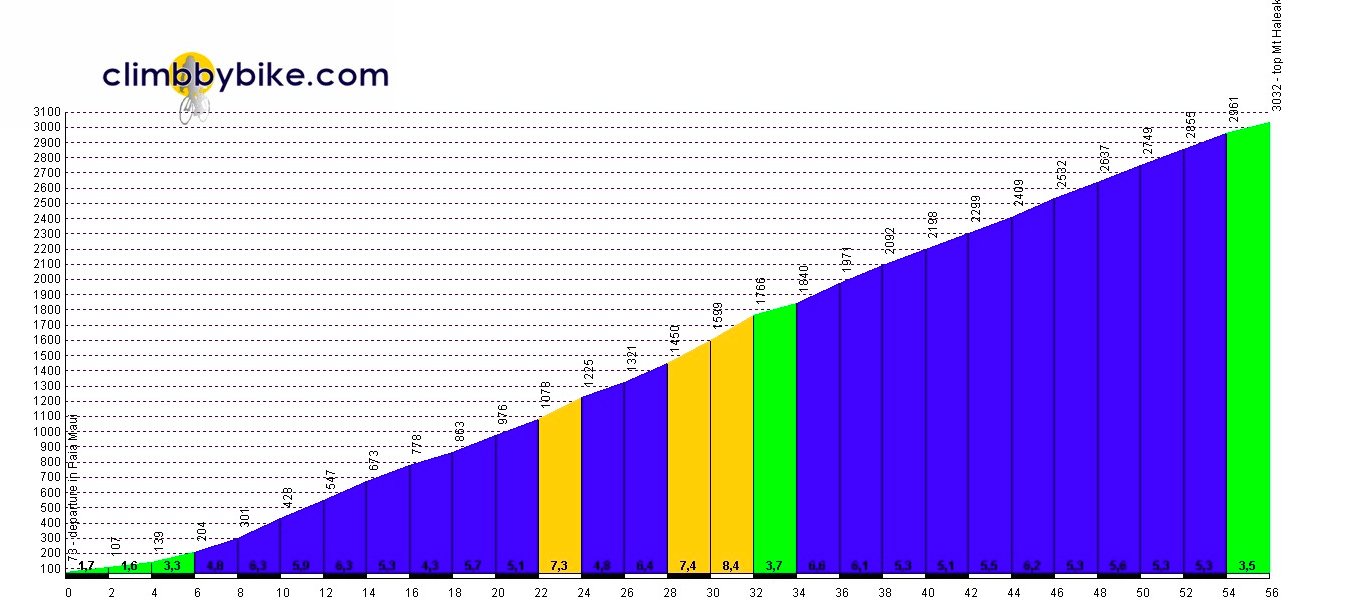 Ascensión situada en Hawái (Estados Unidos), muy exigente por su longitud total, nada más y nada menos que casi 57 kilómetros. El inicio del recorrido se encuentra en Paia, en la costa norte de la isla de Maui, llamado a veces como la capital mundial del windsurf. Con la ascensión al Mt. Haleakala se suman un total de 2.959 metros, con un grado medio de inclinación del 5,3% y una pendiente máxima del 12%. Una subida espectacular por los paisajes que ofrece el entorno hawaiano.